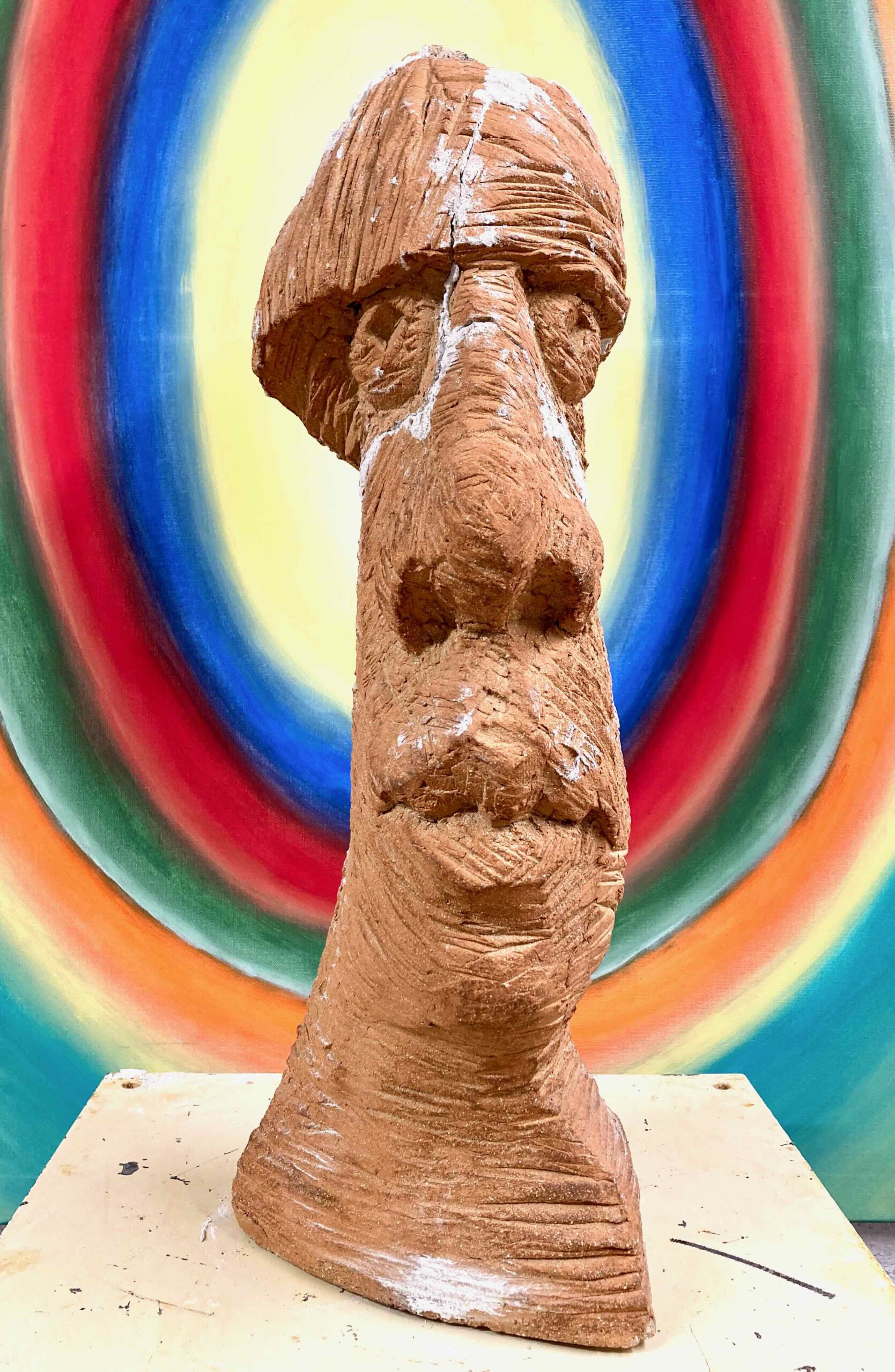 Da die Schädeldecke nicht mehr rekonstruiert werden konnte, war der Blick in das Innere freigegeben. Das Innere war aus purem Gold, was von außen an seinem Ausdruck kaum erkenn bar war. So ist es auch mit einem Menschen: Das Äußere und das Innere sind nicht gleich. Das Äußere von Adolf gab mir keine andere Wahl als es in Braun zu halten. Ich nahm dazu ein dunkles Ocker aus Roussillon/Frankreich. Das Innere wurde golden. So steht er nun da in neuem Gewand.
