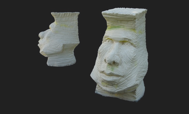 Der Kopf „Neandertaler“ ist aus weißem Ton in kombinierter Aufbau- und Schlagtechnik gefertigt. Sämtliche Formen sind durch die Bearbeitung mit einem Schlagholz entstanden. Seinen Oberflächencharakter wird er durch Aussetzen in die Natur erhalten. Langsam entsteht im Laufe der Zeit eine natürliche Patina.