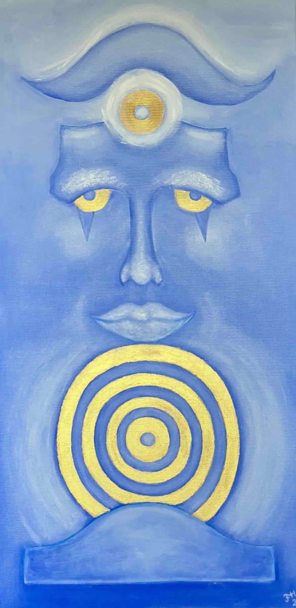 Erstaunliches im Zusammenhang mit einer Pastellskizze: Zur Vorbereitung mancher Gemälde sind Skizzen angesagt, denn einfach hingeworfen verlieren sie sehr an Qualität. Die insgesamt vier Gemälde von Langköpfen in Blau und Gold sind sehr symmetrisch...